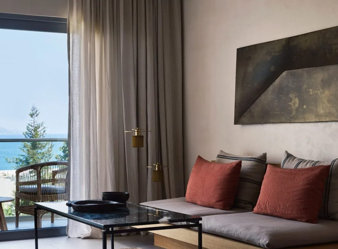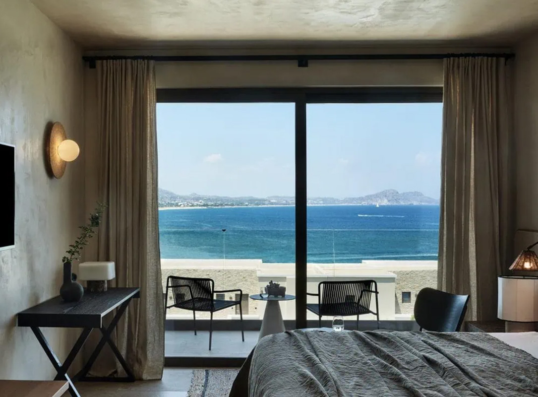 Deluxe suite with king bed, modern design, stylish bath & stunning Aegean Sea view by the sandy-pebble beach.