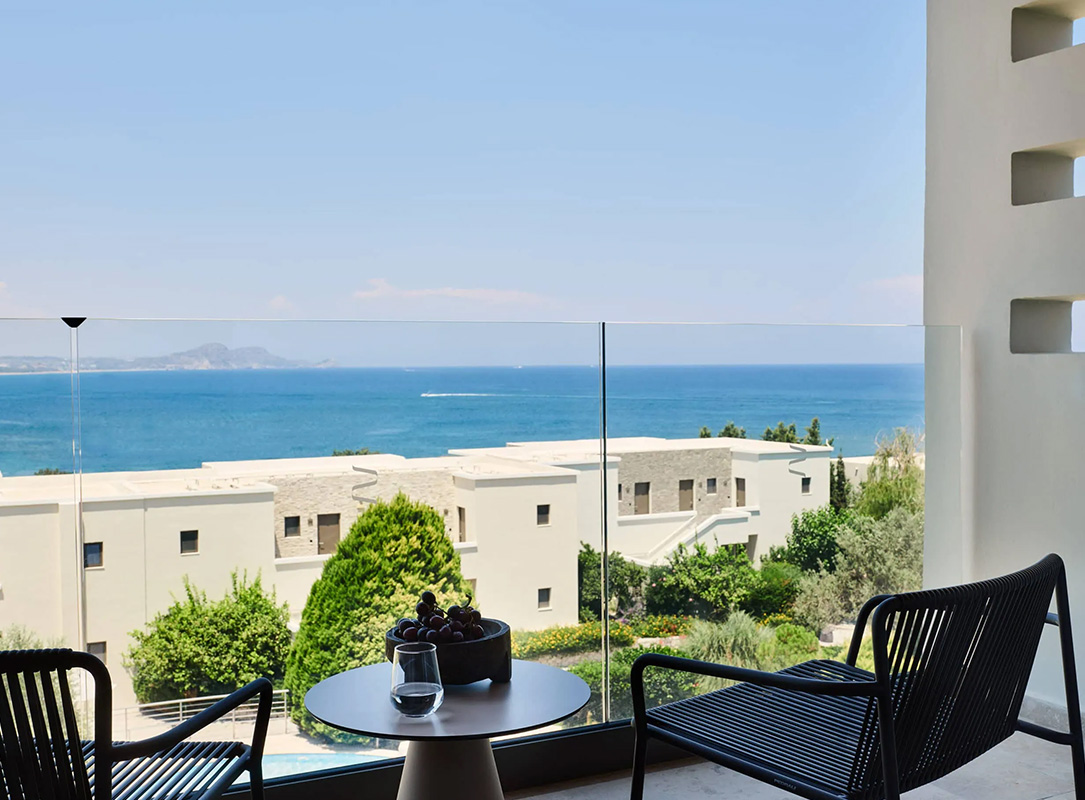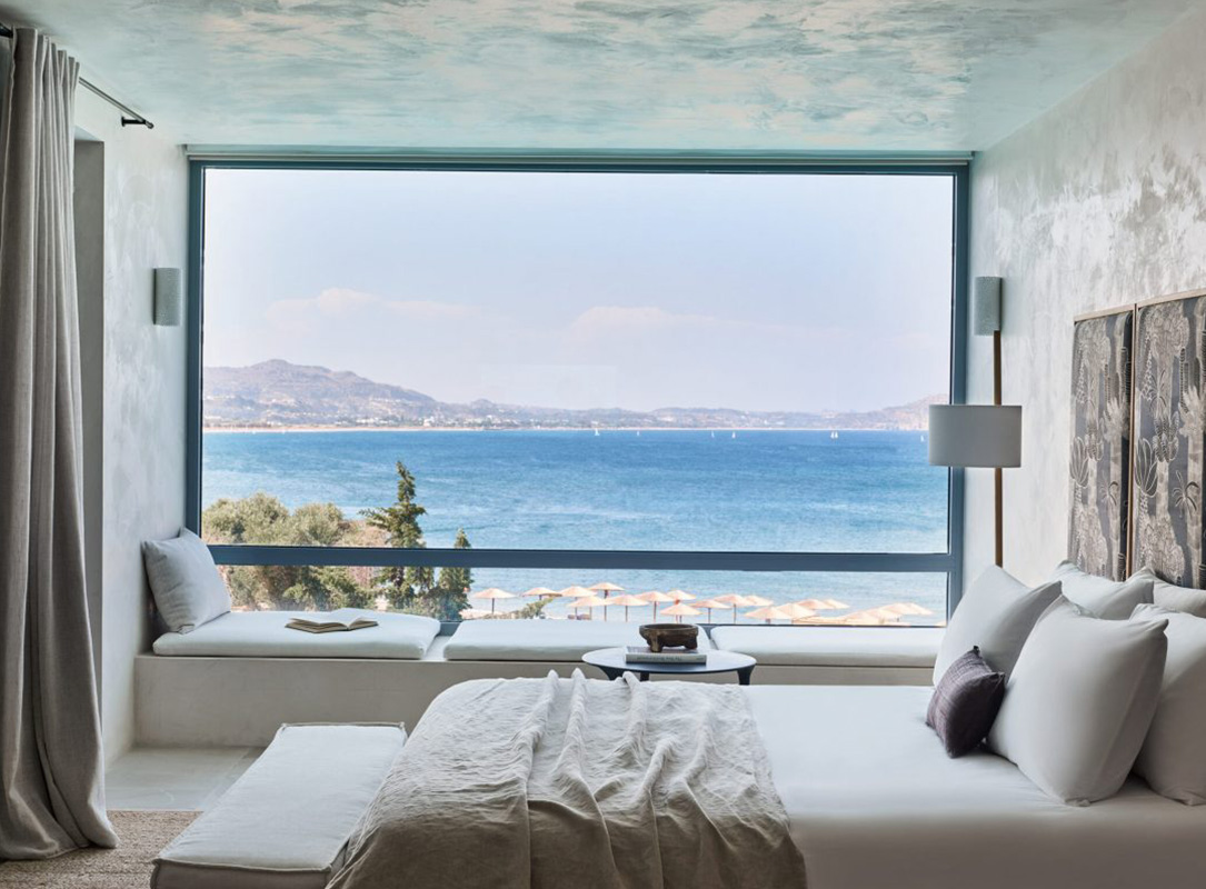 Sea view rooms on upper floors with direct views of the Aegean’s blue hues.
