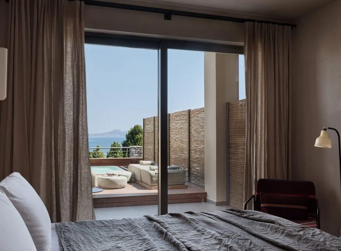 Beachfront Bungalow suites with private & mini hydro pool, stylish 55 sqm interiors, earthy tones & Aegean sea views.